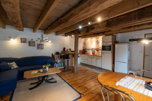 Das geräumige Wohnzimmer mit integrierter Küchenzeile lädt zum Verweilen ein.